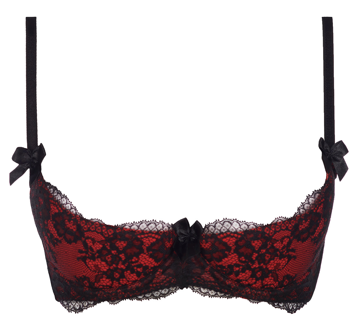 Black flowers blossom with sophisticated embroidery on the red cups of peek-a-boo bra Cherry Pie V-7801. The bold cut of the cups will expose the beauty of your breasts. Removable straps allow you to emphasize your feminine attributes...