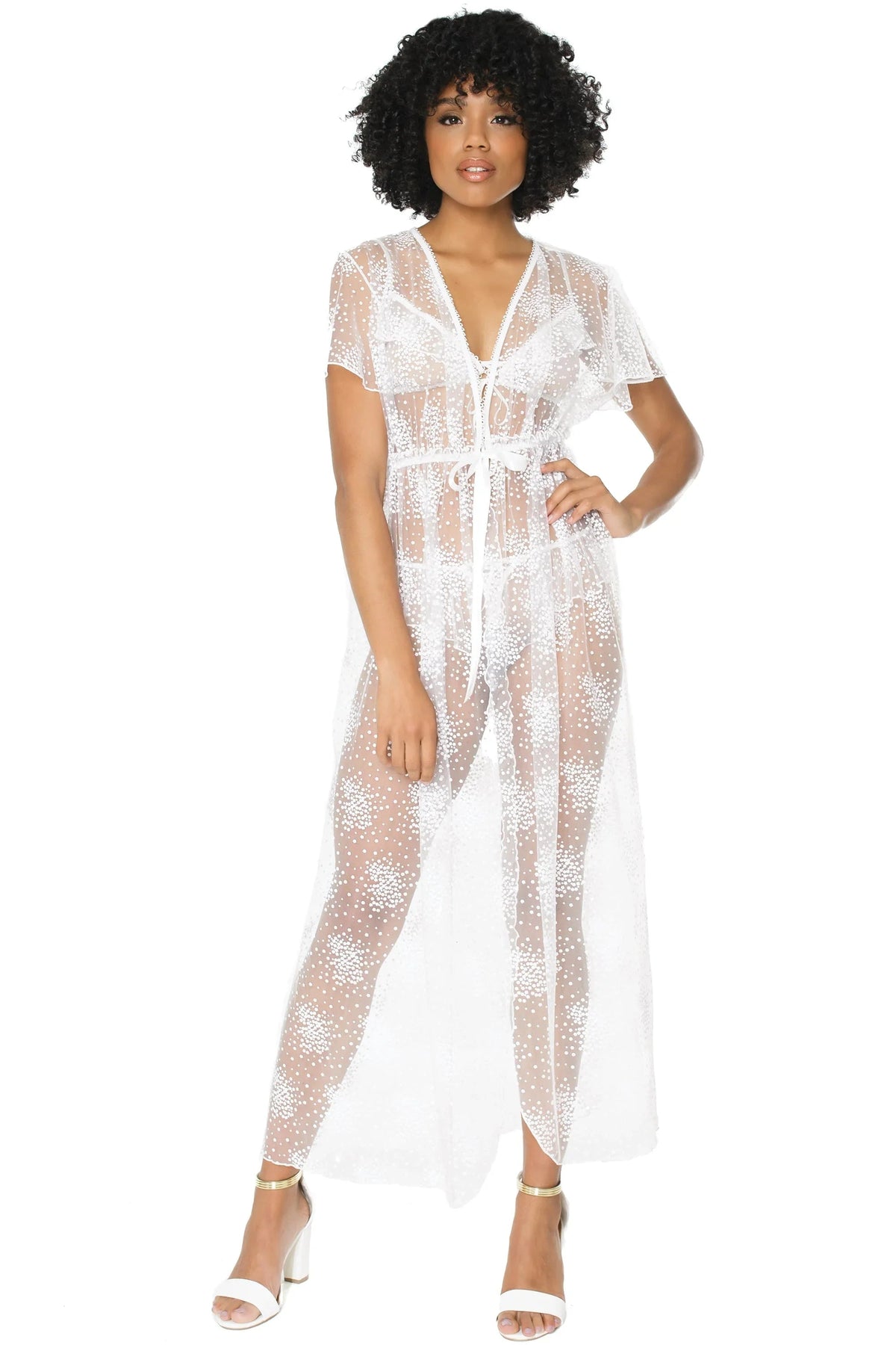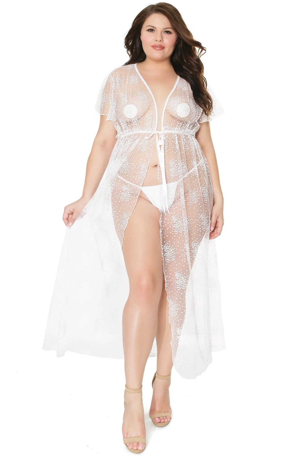 Our Petal Soft Robe is designed for luxurious comfort, featuring a maxi length and flutter cap sleeves. It has an elasticized waist and delicate front ribbon ties for adjustable styling, and is made from soft floral tulle for a dreamy, ethereal feel. Perfect for lounging or special occasions.