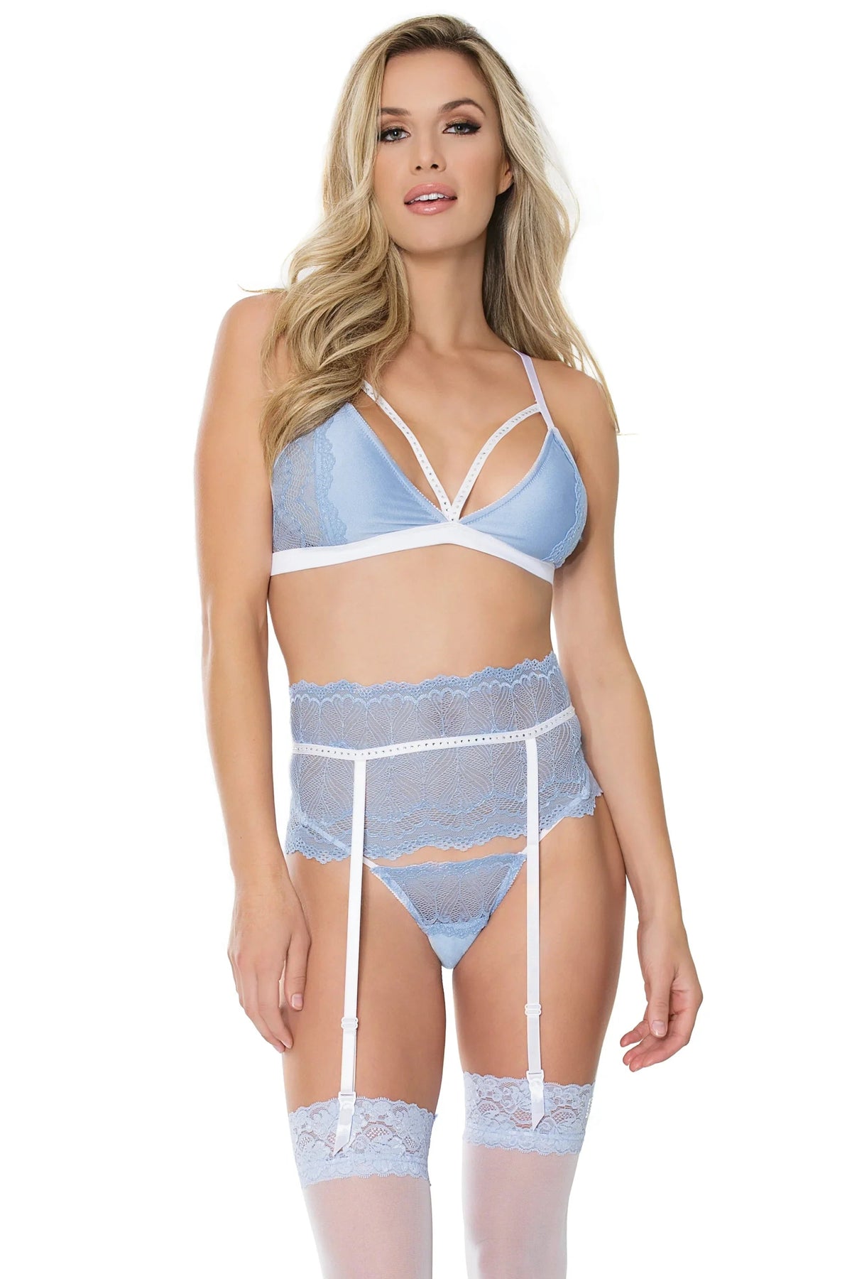 The Far Far Away Bra Set is a sophisticated blend of elegance and allure. With triangle cups and a light blue and white color palette, this set features metallic stretch lace details. Adjustable straps and back hook-and-eye closures allow for a customizable fit. Attached garters and rhinestone elastic trim add a playful touch, while the adjustable G-string crafted with delicate scallop stretch lace and knit materials will make you feel enchanting.