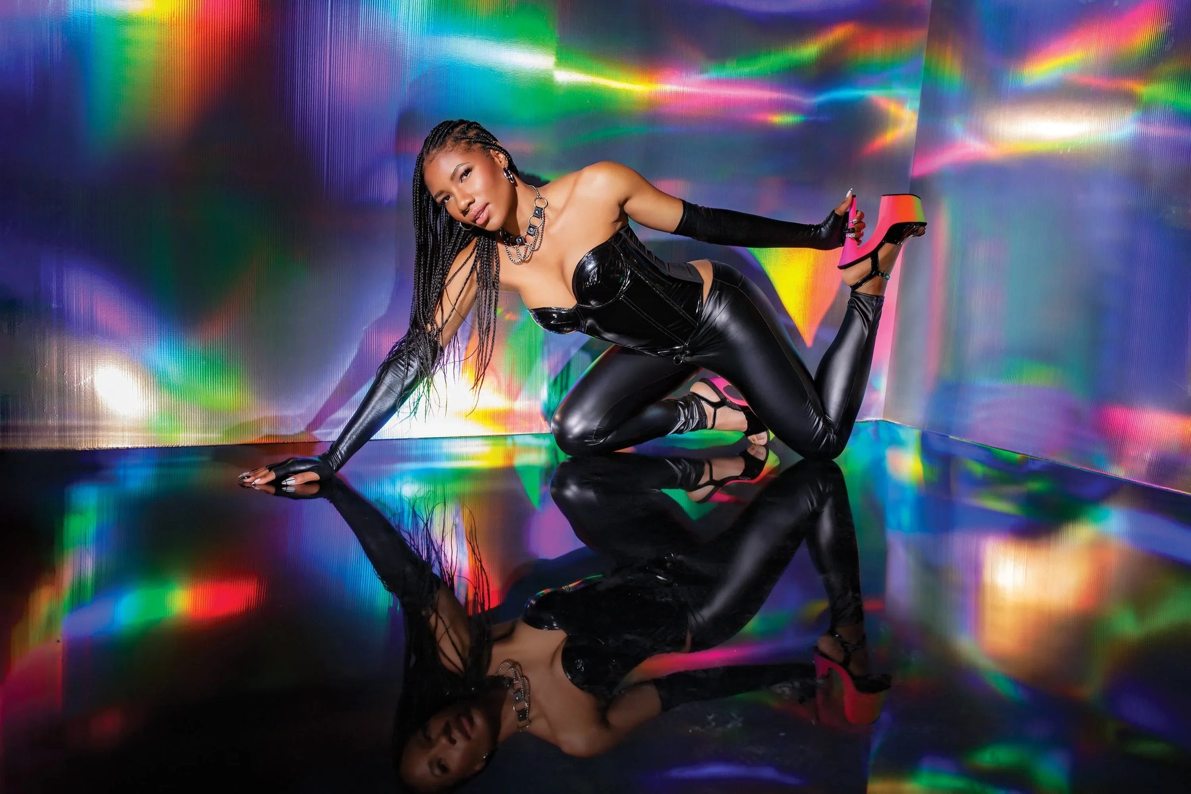 • Shown With: Tartan Tease Skirt, Overtime Stockings, Vegan Leather Collar, Vegan Leather Handcuffs, Glossed Over Thong