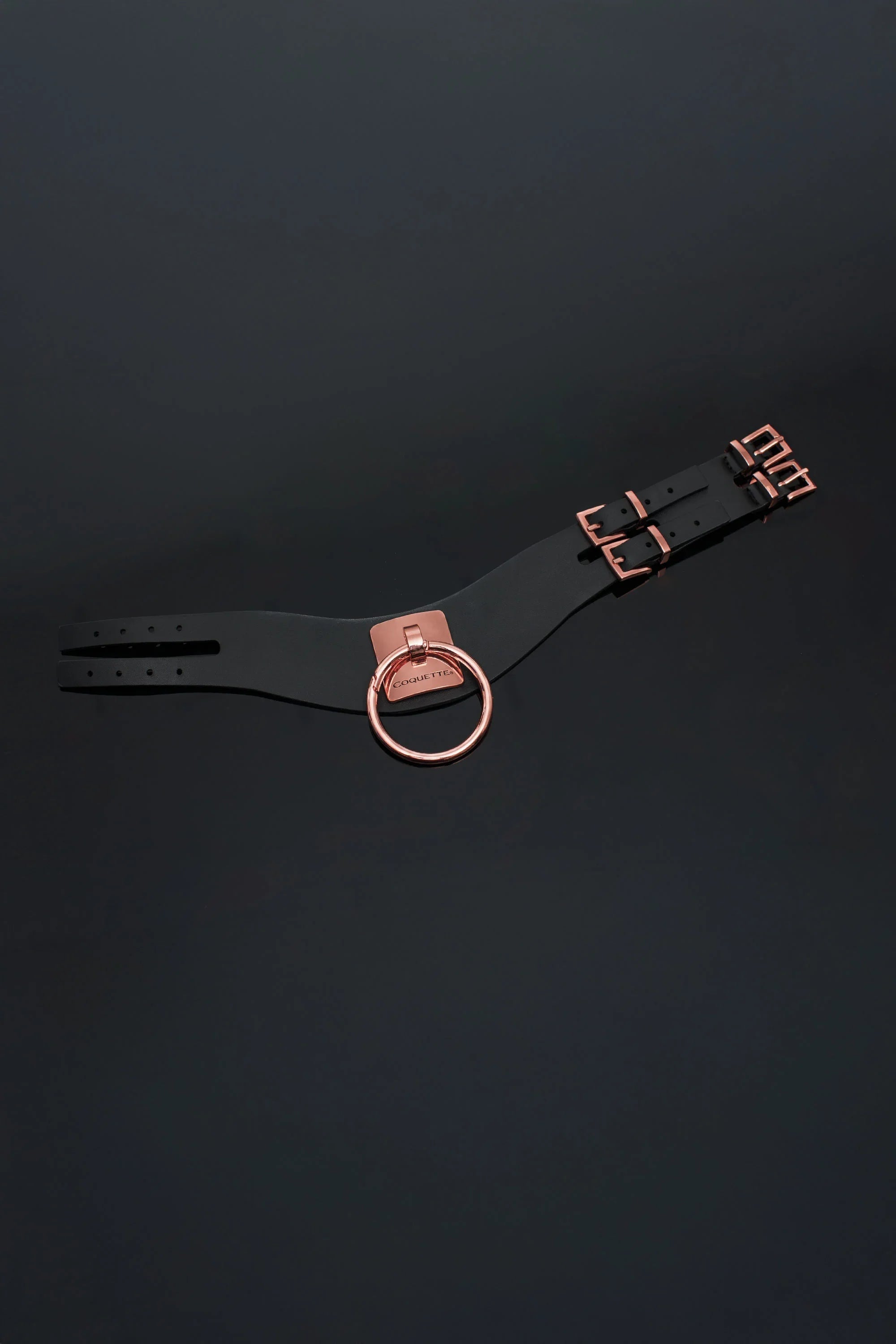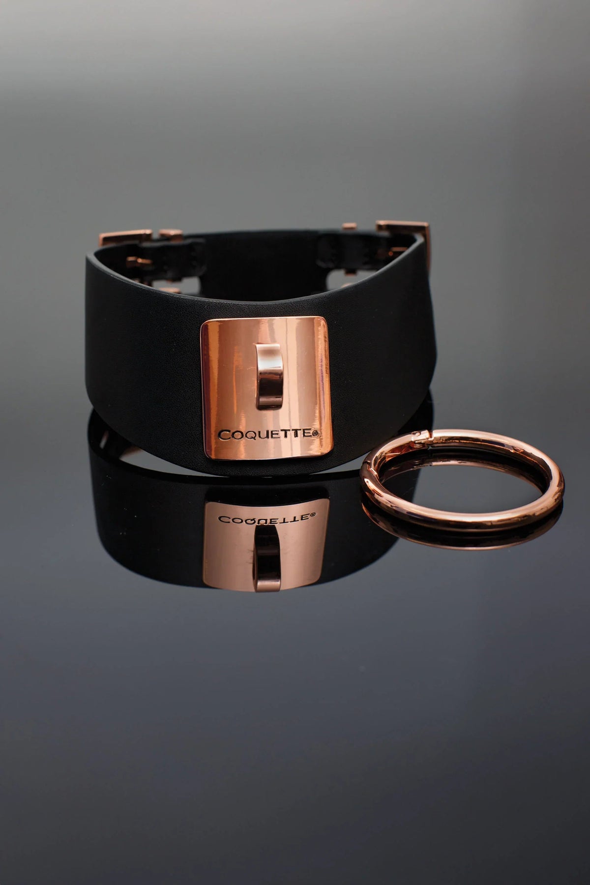 Crafted with rose gold-toned hardware, this stunning collar combines elegance and edge effortlessly. The versatile large metal opening ring allows for seamless attachment to other accessories, making it a versatile addition to your collection. Featuring a COQUETTE engraved metal plate and back buckle closures providing adjustable sizing for a comfortable yet secure fit. Perfectly compatible with bondage lingerie and other accessories, this collar invites you to explore your adventurous side with confidence and flair.