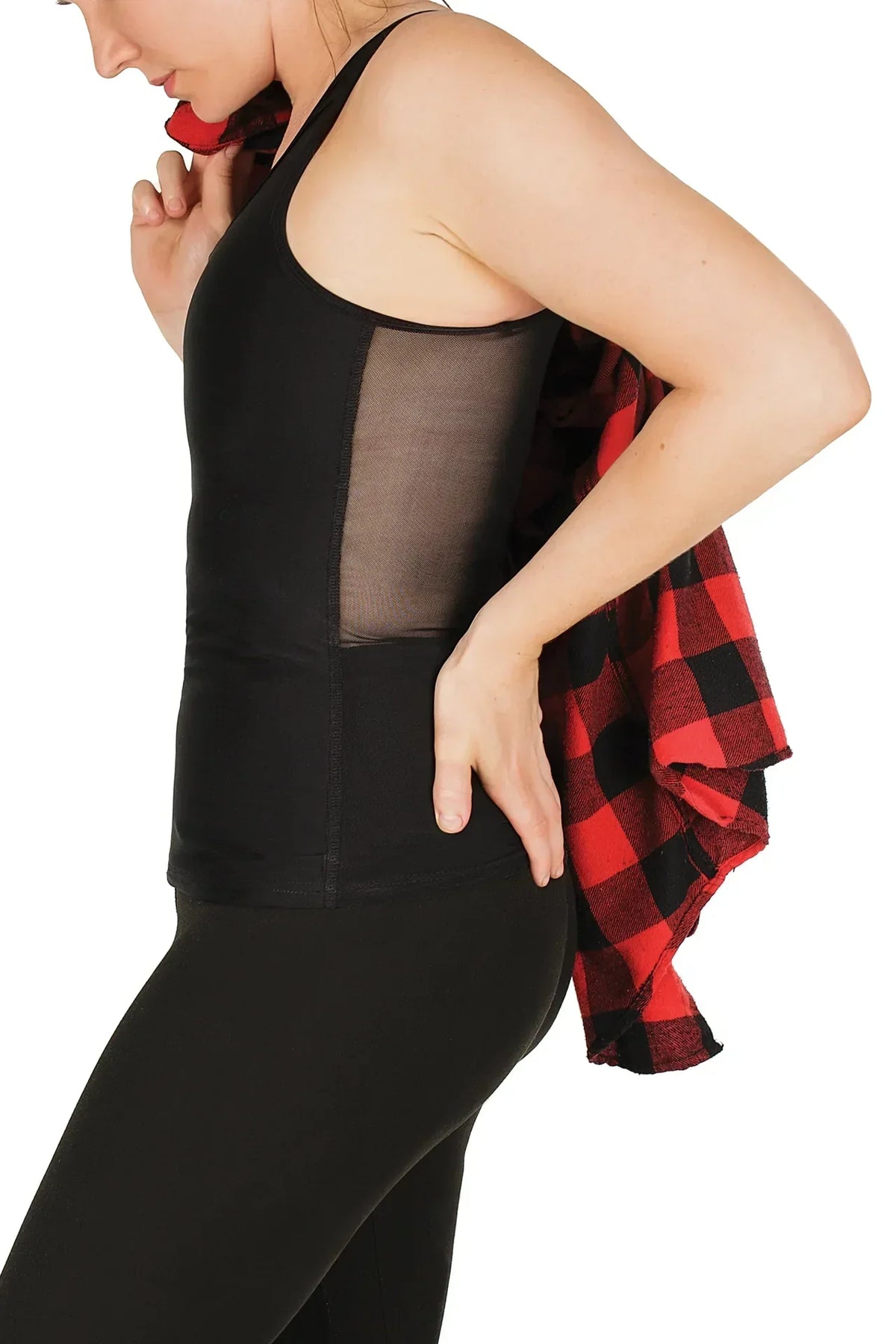 The chest area of this garment is designed with double compression layers of pressured stretch material to create the binding effect, while the back, stretch mesh panel allows for comfort and breathability. This garment should be washed before first use. To preserve the longevity of the binder, hand wash in cold water with gentle detergent and hang to dry.