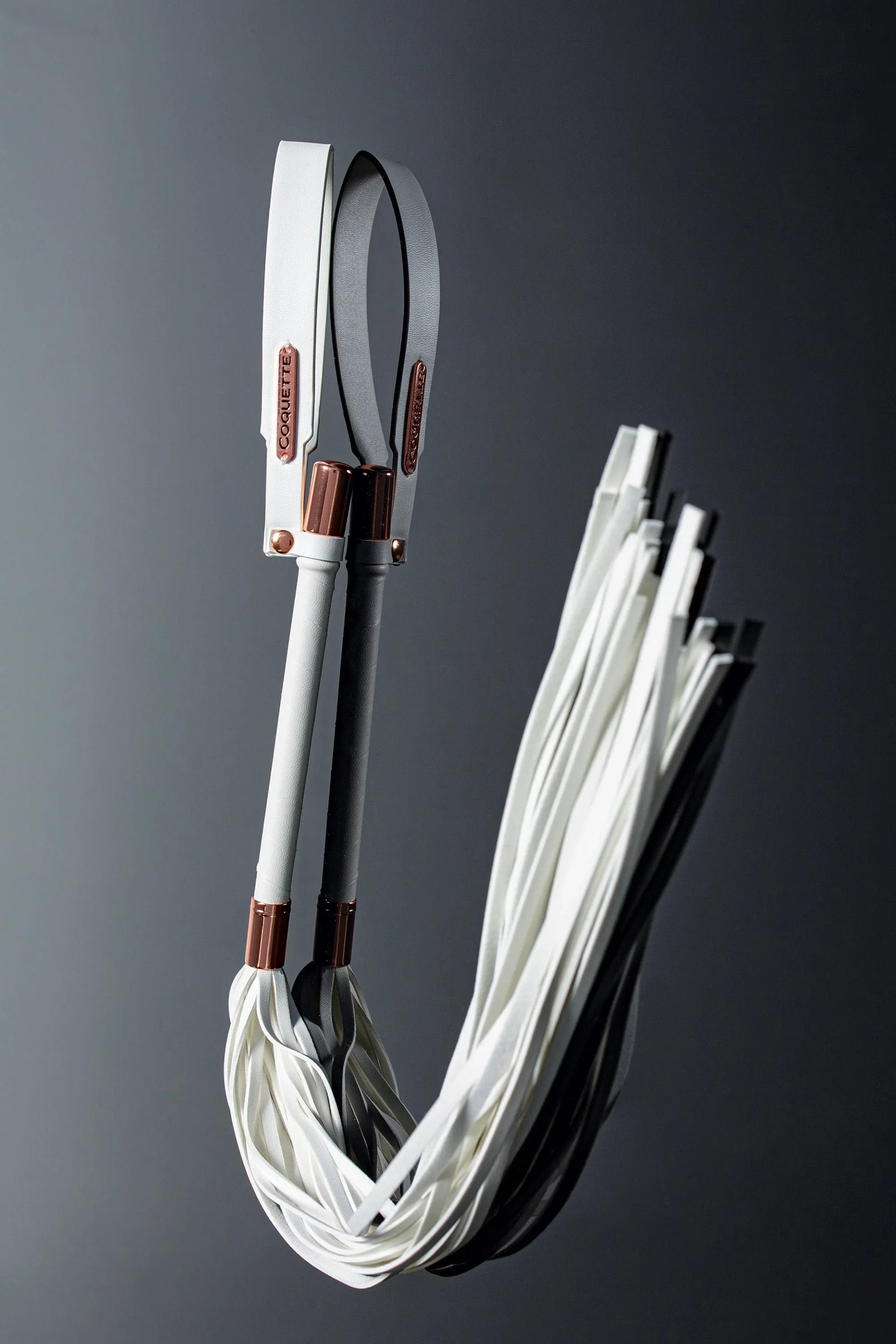 Unleash your desires with this Vegan Leather Flogger. Featuring eye-catching rose gold hardware, the matte finish diamond-printed handle for easy maneuvering. The soft vegan leather tails deliver tantalizing sensations, making every swing a thrilling experience. Complete with a convenient wrist strap, this flogger is perfect for both beginners and seasoned enthusiasts looking to elevate their play.
