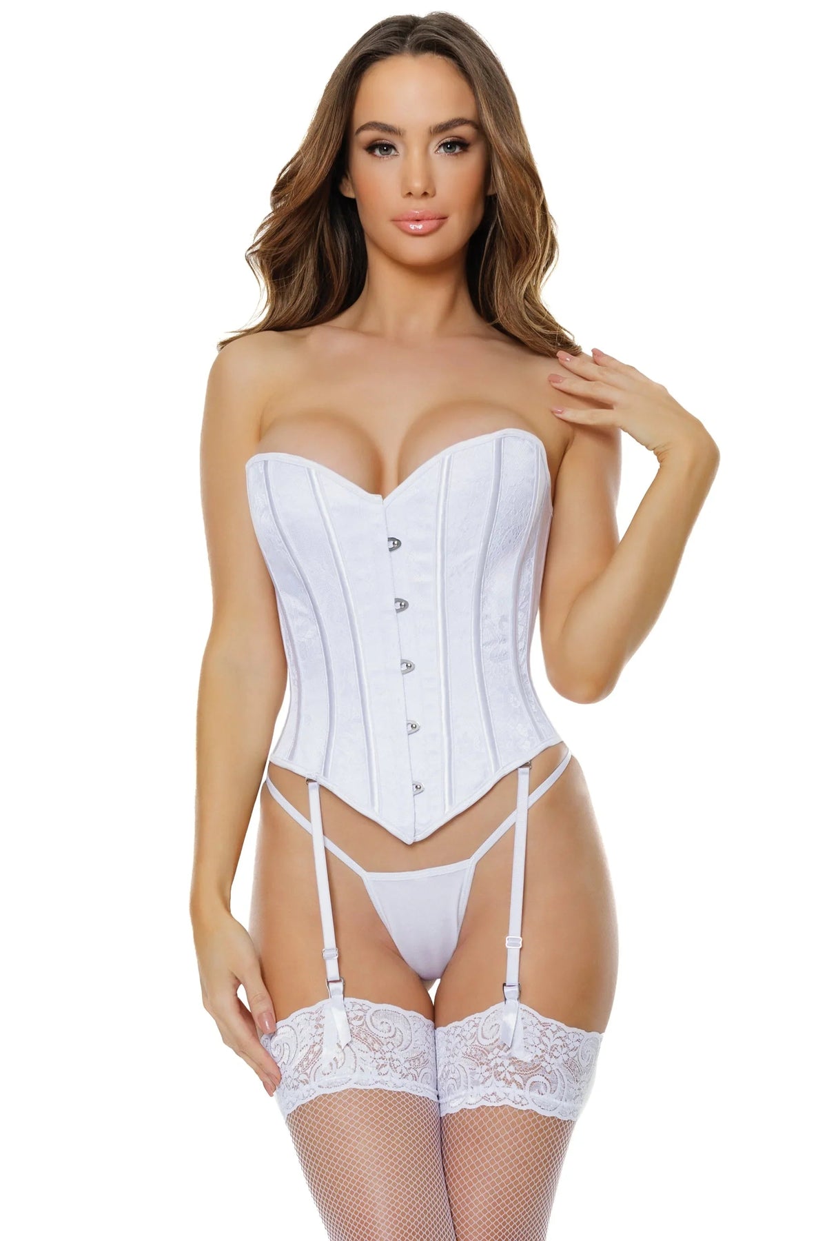 Experience the elegance and versatility of the Forevermore Corset. With a secure metal busk closure and boned seams for shaping and support, it features a classic cord lace-up back and removable straps and garters for an adjustable fit. Silver-tone hardware adds a touch of shine to the luxurious lace and satin design.