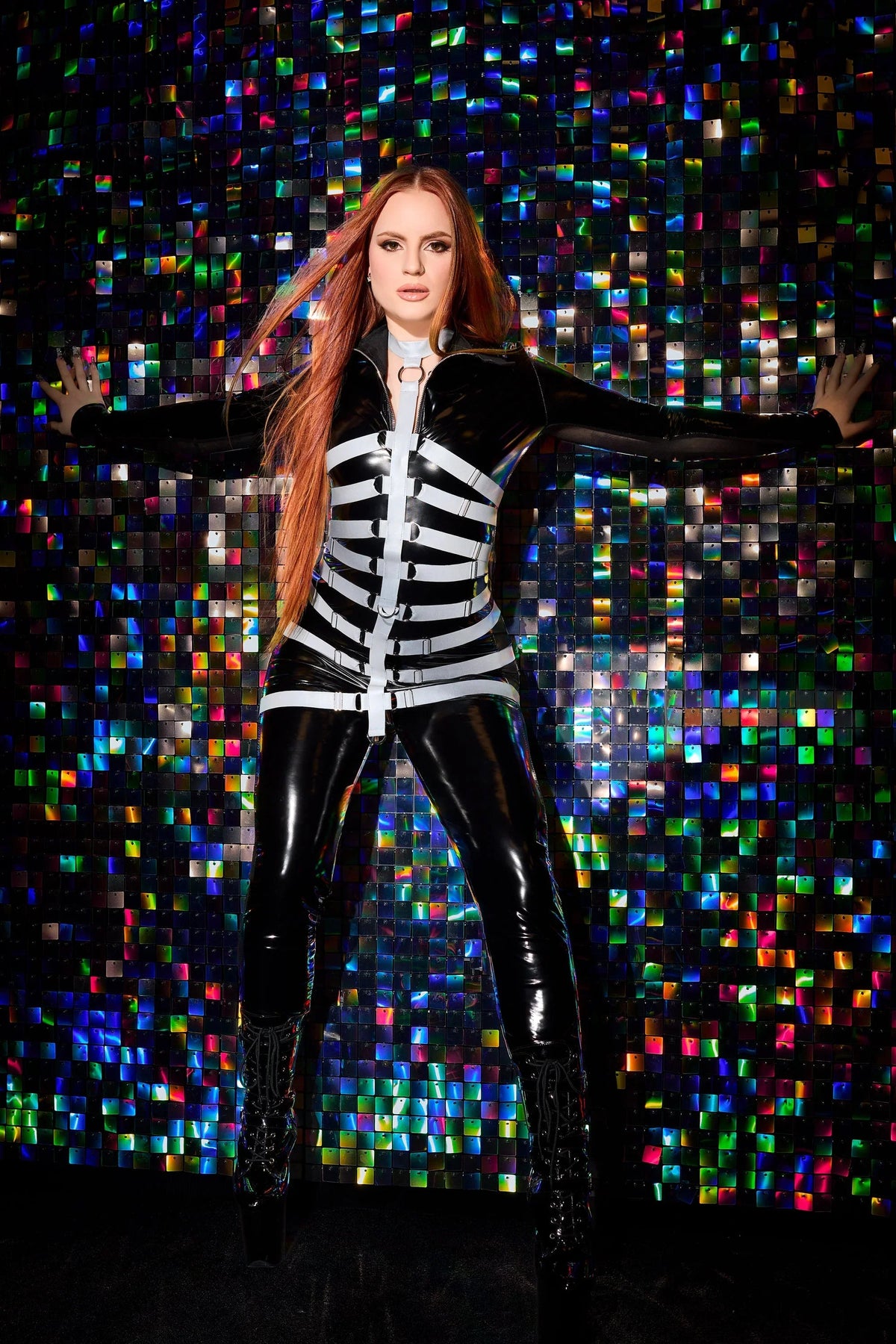 Turn heads in this striking harness set featuring a reflective appearance that radiates bold confidence. The set includes a structured top and skirt, both designed with adjustable straps for a customizable fit. Perfect for layering, its skeletal effect creates an edgy and futuristic look, accentuated by silver-tone hardware for a sleek finish.
