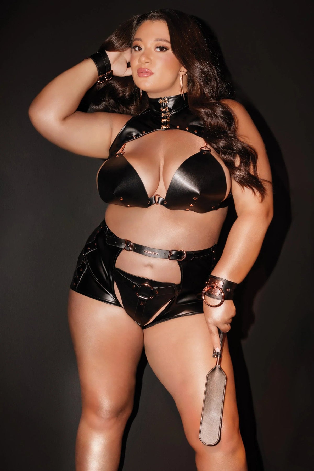 This edgy shrug and chaps set is designed with decorative metal grommet details for a striking look. Featuring a metal hook & eye neck closure and a double metal buckle closure at the waist, it combines secure wear with a bold, statement-making style. Perfect for adding a daring touch to any lingerie look.