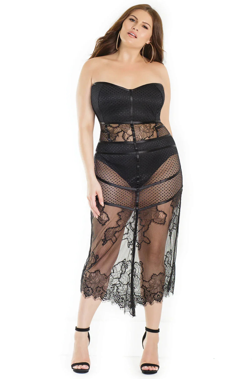 Get ready to turn heads in the Nightfall Dress & Panty set. Made with a combination of sexy fence net, delicate lace, and comfortable microfiber material, this set is perfect for a night out. The dress comes with lightly padded shelf cups and a zipper back closure, while the matching high waisted panty features strappy style lines and a full coverage fit. With adjustable/removable straps, this set offers both style and practicality.