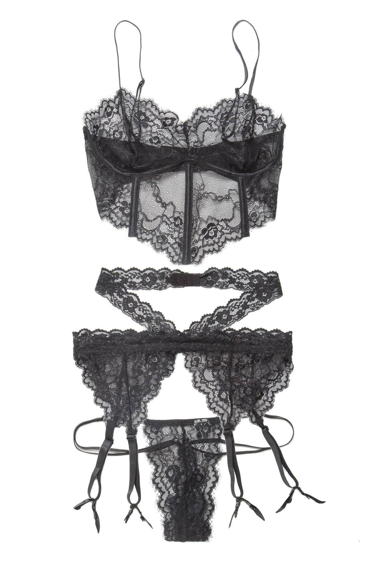 Get the perfect balance of sophistication and allure with Elegant Edge Gown Bra & G-String Set. Featuring a longline soft cup bra with delicate scallop lace and front boning for subtle shaping, this set exudes an effortless charm in White or Black. Add structure and drama with the strappy garter belt detail and complete the ensemble with an adjustable G-string for ultimate comfort. Perfect for special occasions.