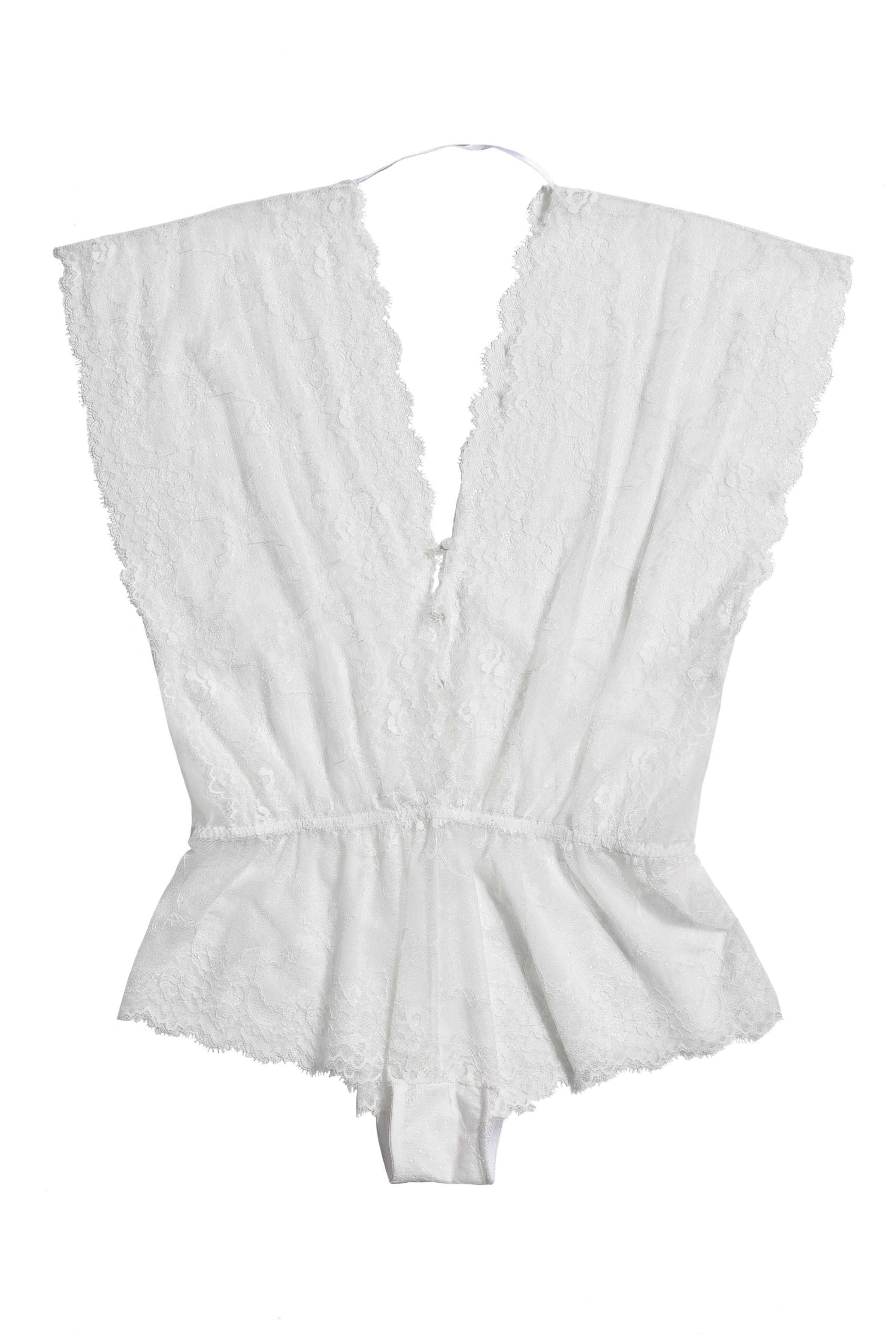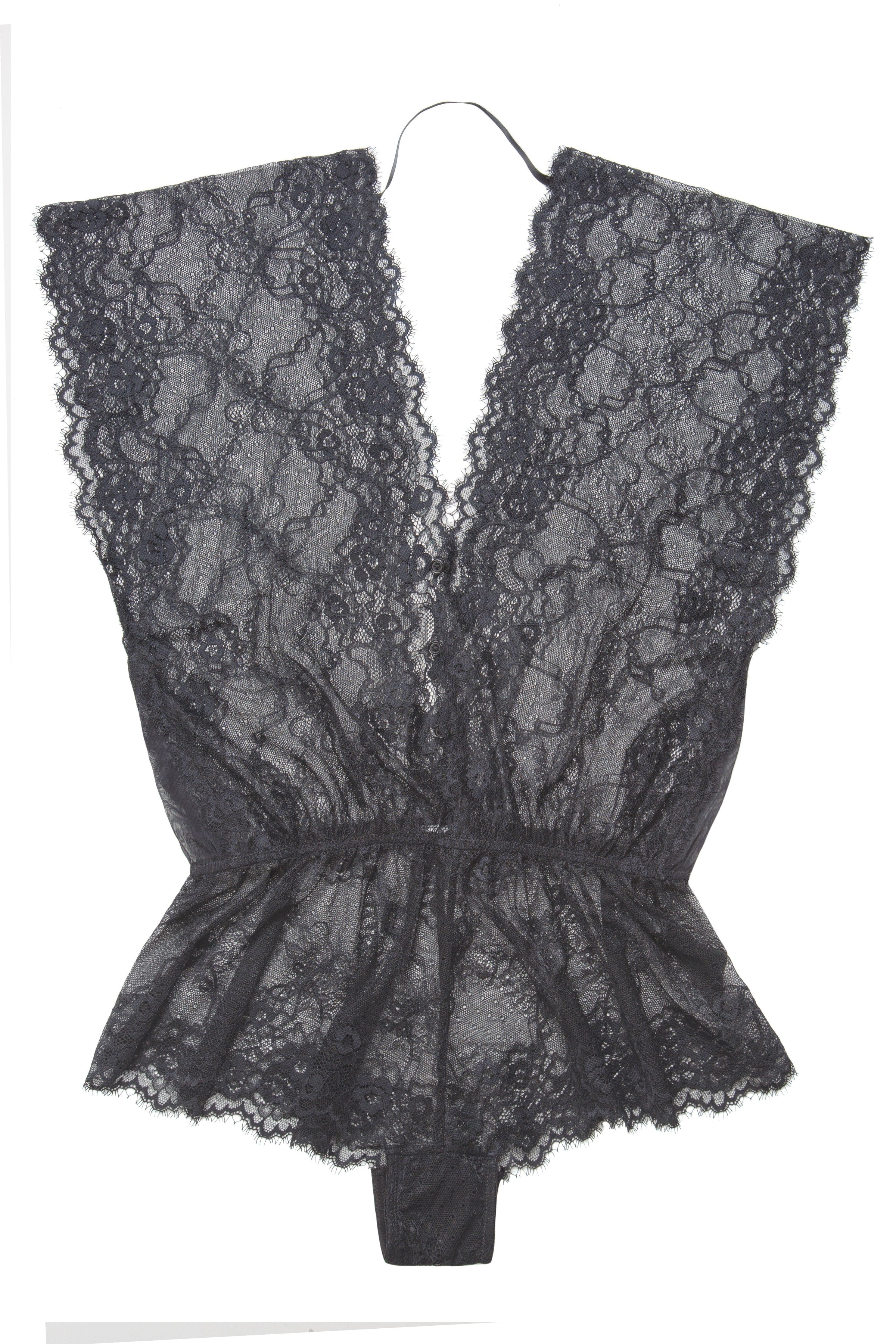 The C'est Chic Romper is a sophisticated piece with a sultry deep 'V' neckline and a button-up front, creating a flattering silhouette. Its elasticized waist offers a comfortable and contoured fit, while delicate scallop stretch lace adds an elegant, feminine touch. Perfect for any occasion, this romper is available in classic white or black.