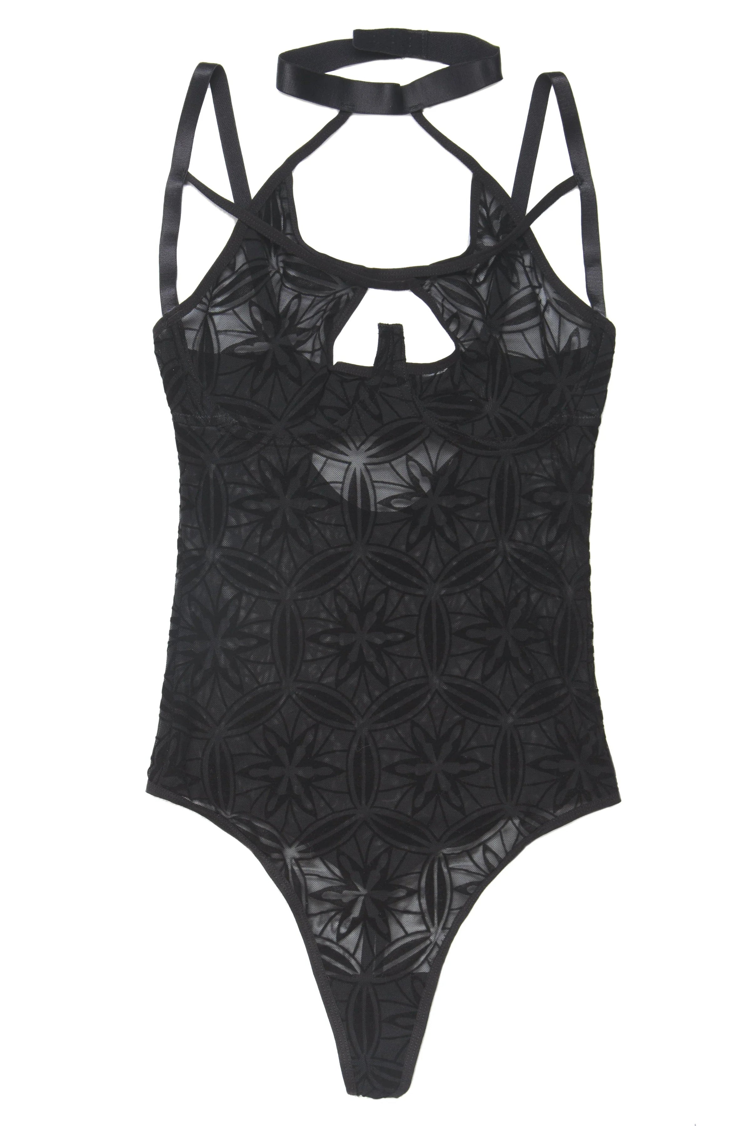 This sensual flocked mesh teddy combines intricate details and a flattering fit. The halter neck design and underwire cups provide lift and support, while the criss-cross strap details add a bold, stylish touch. With adjustable straps for a customized fit and a removable hook-and-eye thong back.