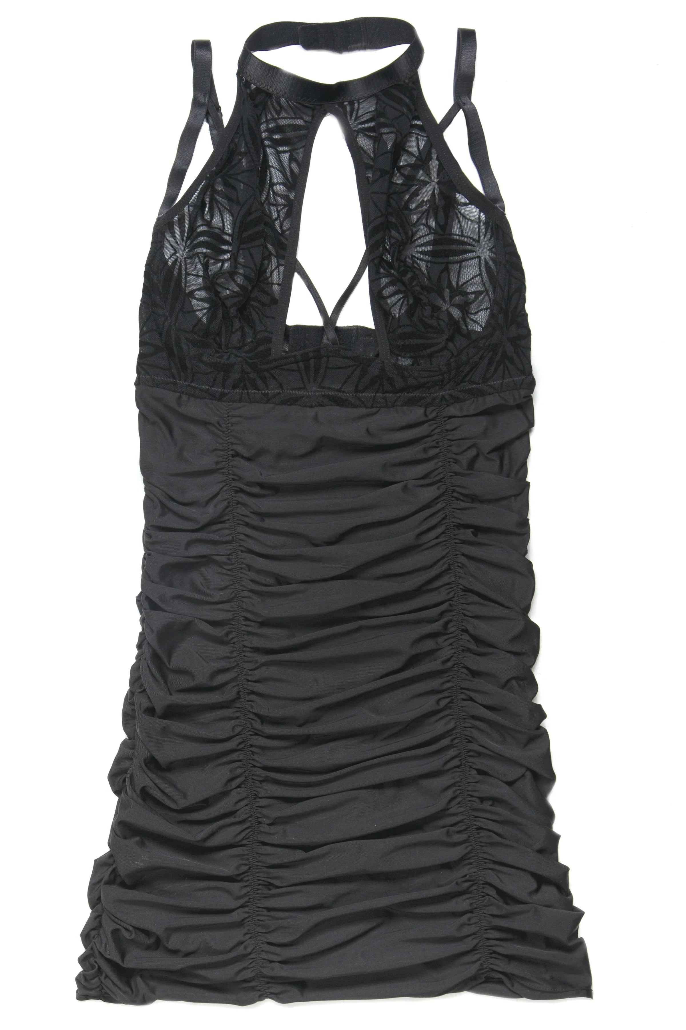This captivating flocked mesh and microfiber chemise offers a seductive blend of elegance and allure. The halter neck design accentuates the shoulders, while the monowire cups provide support and shaping for a flattering silhouette. Cross-cross strap details enhance the sensual appeal, and the ruched skirt detail adds texture and dimension. A center back hook and eye closure ensures a secure fit.