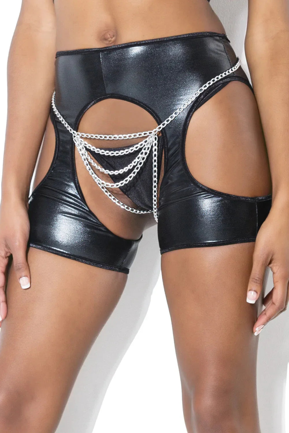 Experience the allure of Extra Juicy Booty Shorts. These black booty chaps have a sleek, wet look finish that highlights curves and adds bold confidence to any outfit. Designed for comfort, these shorts are perfect for parties, festivals, and nights out. Add drama and flair to your wardrobe with these seductive shorts.