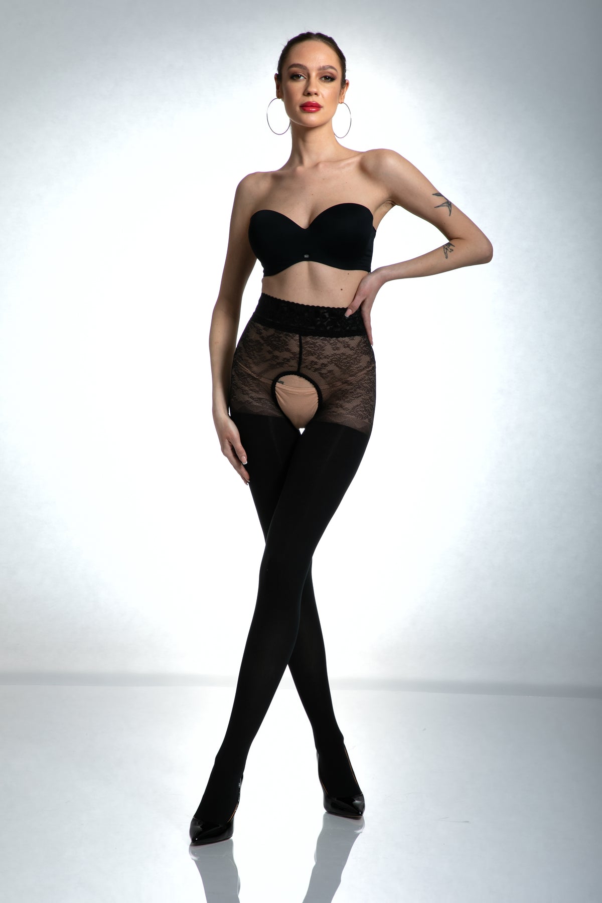Extravagant, opaque pantyhose with lace "open crotch" panties. Decorated with effective black diamonds that form the seam. The upper part is finished with a lace waistband covered with silicone. The product is made of Italian yarns of the highest quality.