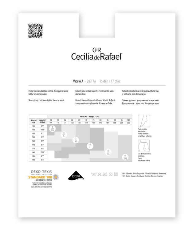 One of Cecelia de Rafael's most popular styles is now available in a Crotchless version. Super Sheer 15 Denier very fine and delicate tights with a high sheen effect, flight attendants love these tights. These glossy pantyhose are very elegant and at the same time the gloss make them super sexy. The light feeling and transparency that these tights offer are incomparable. We recommend them for special occasions and casual wear, and even business outfits can only benefit from such a nice and sophisticated accent. The open gusset has a slight t-band reinforcement for added durability to the otherwise sheer to waist style. The yarns are almost glass clear so it gives the illusion of absolutely transparent pantyhose. Experience the luxury of European designed and manufactured hosiery.