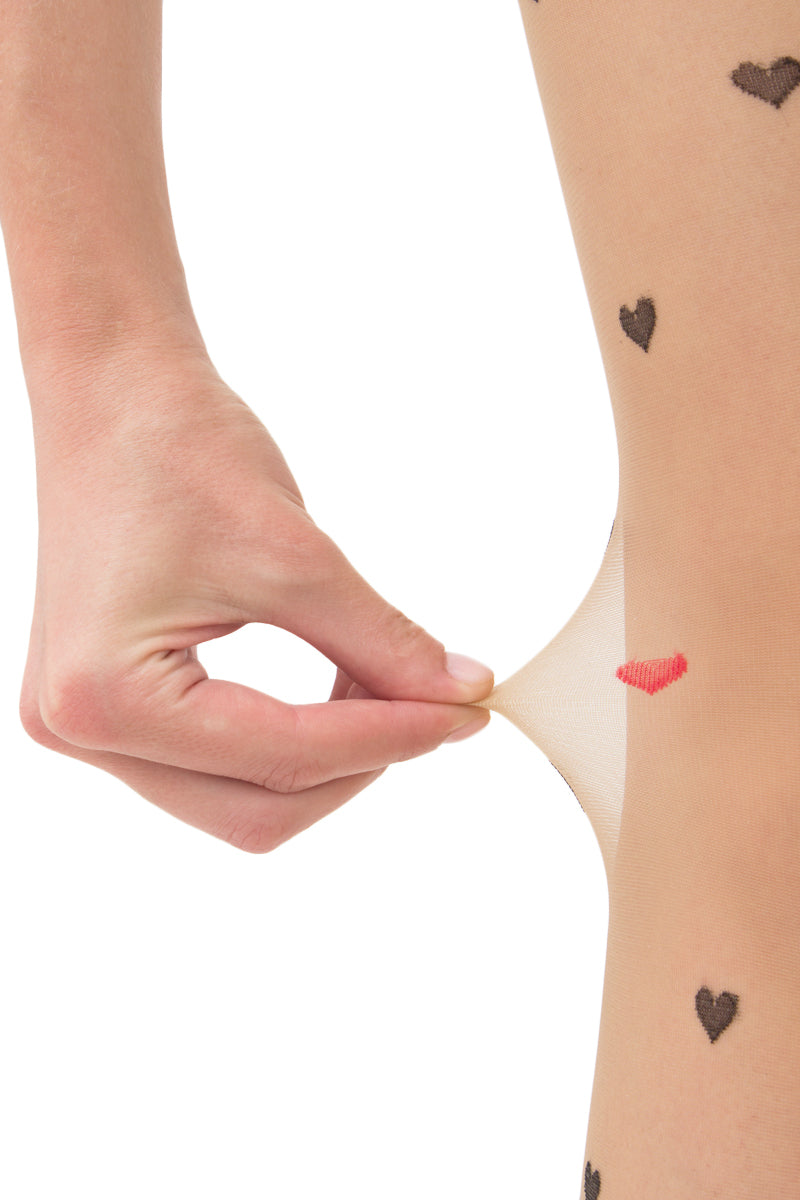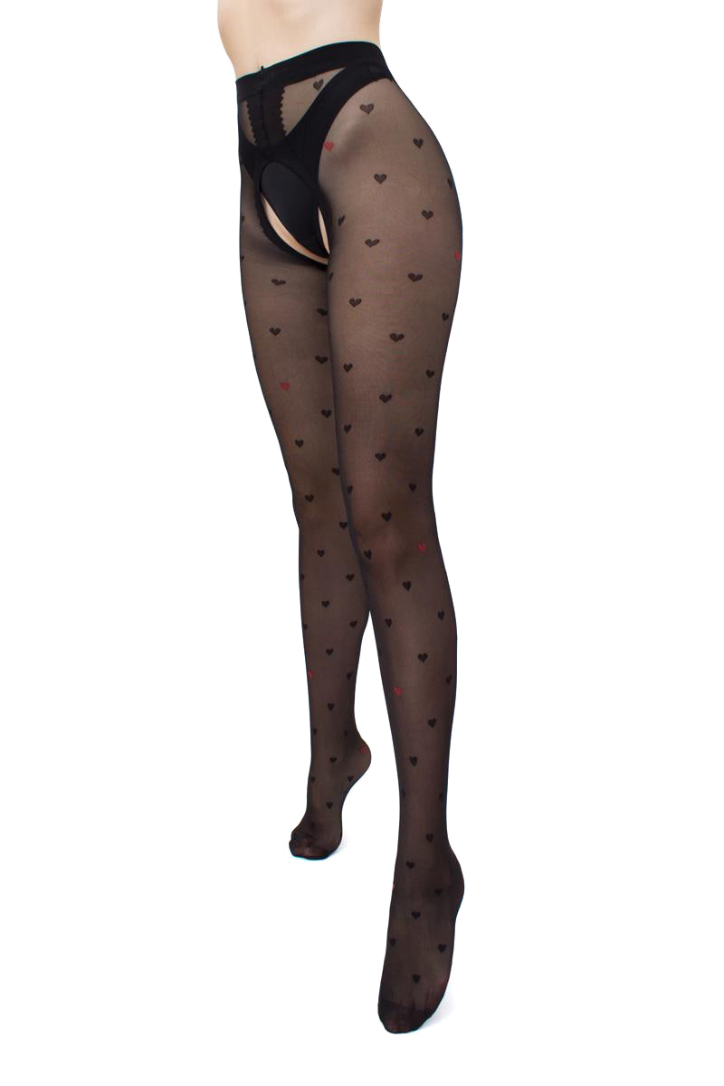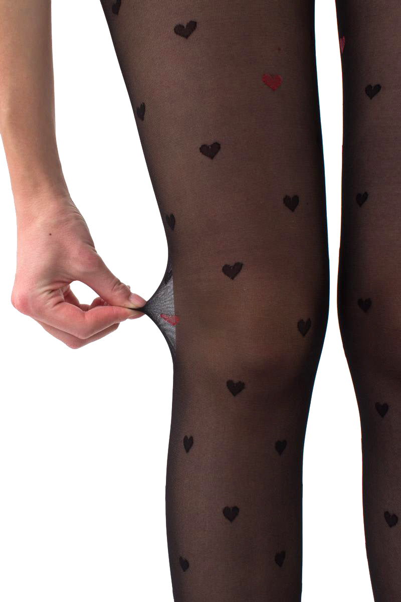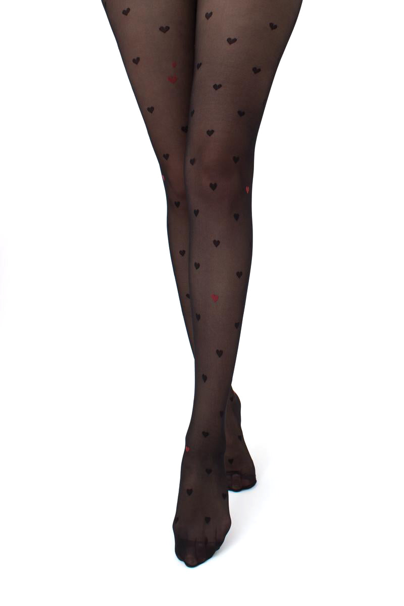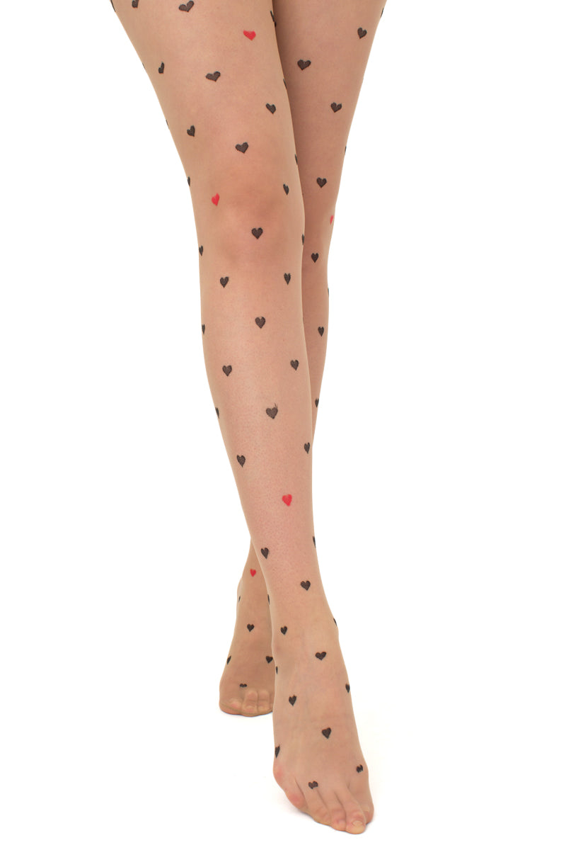 These delightful open sheer tights are adorned with delicate tiny black and red hearts.