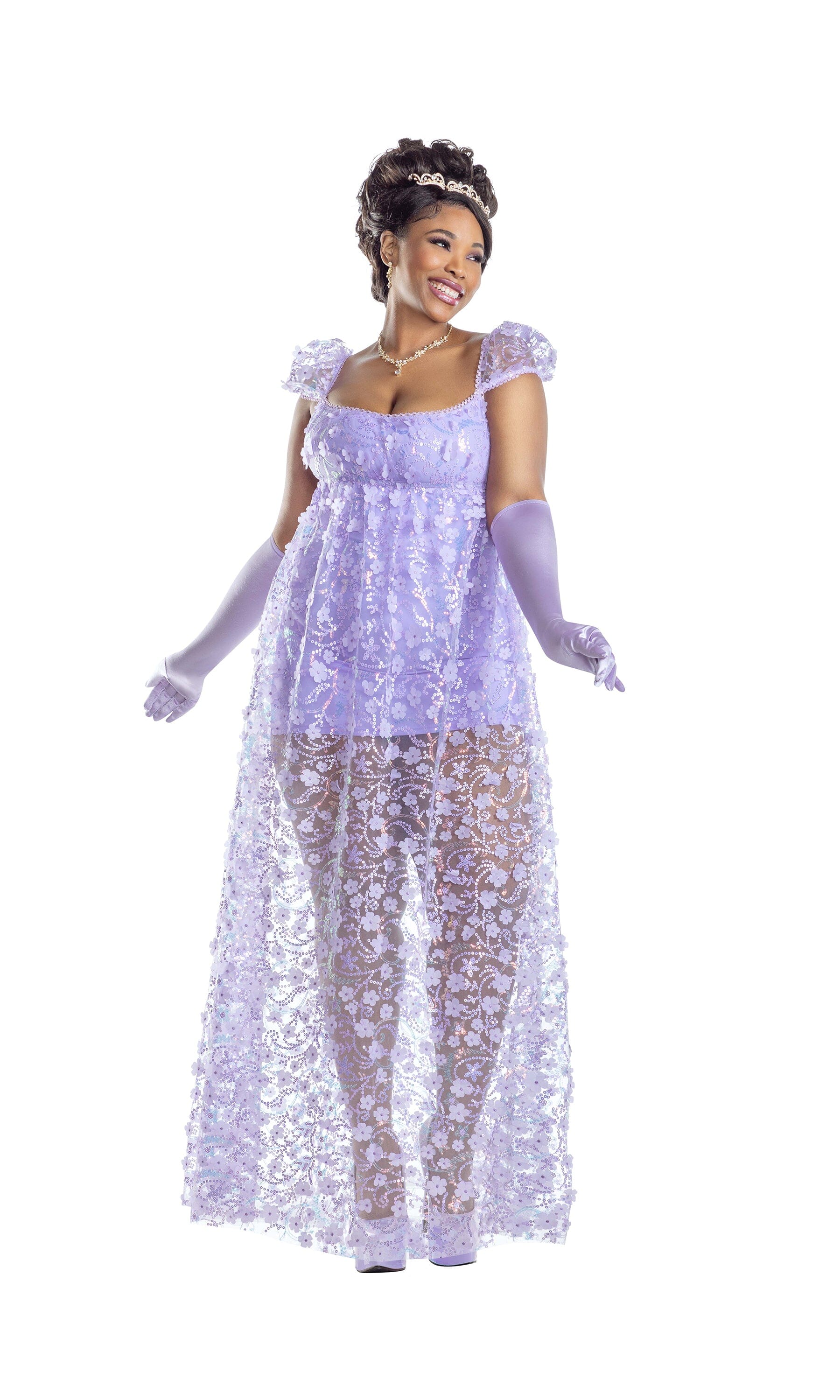 PLUS Bridgerbabe purple 3D lace empire dress with puff-sleeves and built-in mini dress. Comes with matching gloves and crown. Earrings and necklace not included.