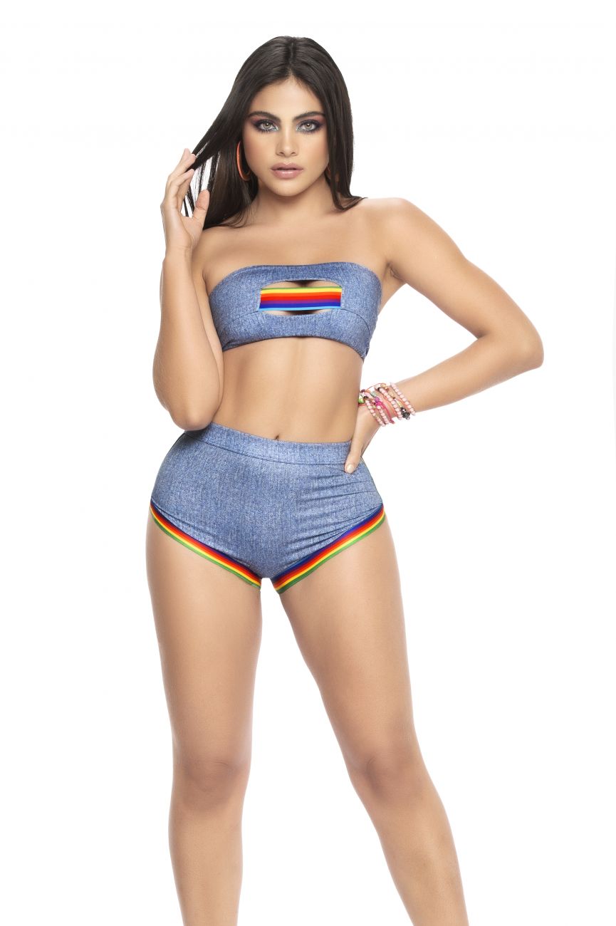 An ultra sexy and comfortable set to create the most memorable memories. Denim print bandeau top with flirty front cutout and rainbow elastic band accent, matching high-waist cheeky bottom