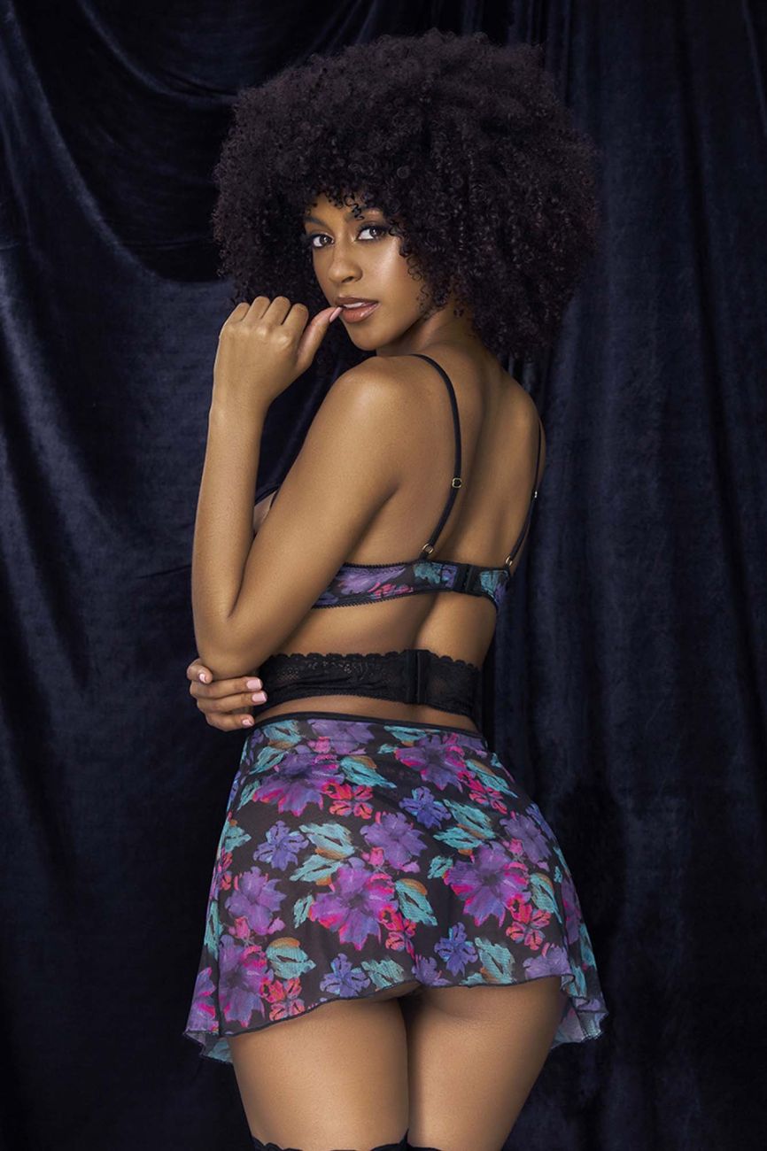 Romanticism and versatility in a convertible babydoll that includes a floral print and lace top with adjustable straps, garter belt, matching thong and a removable skirt.