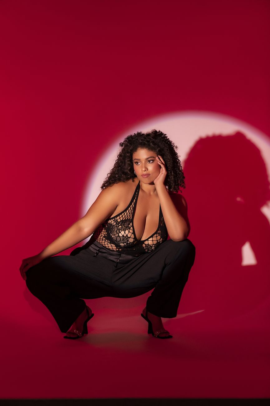 A versatile fishnet bodysuit that can be styled with either a halter or crossed neckline. It features front floral details and an alluring lace-up design at the back.