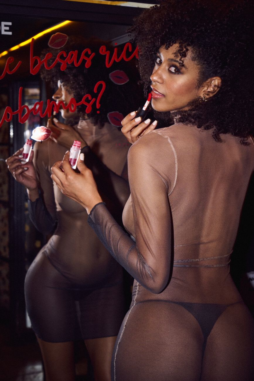 Long-sleeved dress in a stretch mesh with an ombre print in neutral tones. Includes matching thong.