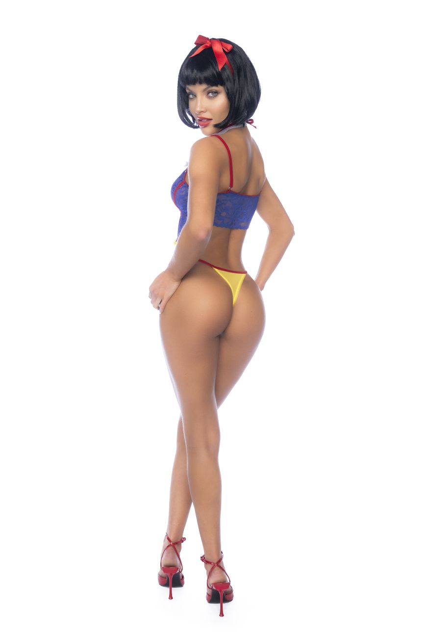 Embody the character in this four-piece poisoned apple princess costume, featuring a top with adjustable straps and a front lace-up design, a thong with bow detail, and a ribbon headpiece and neckpiece.