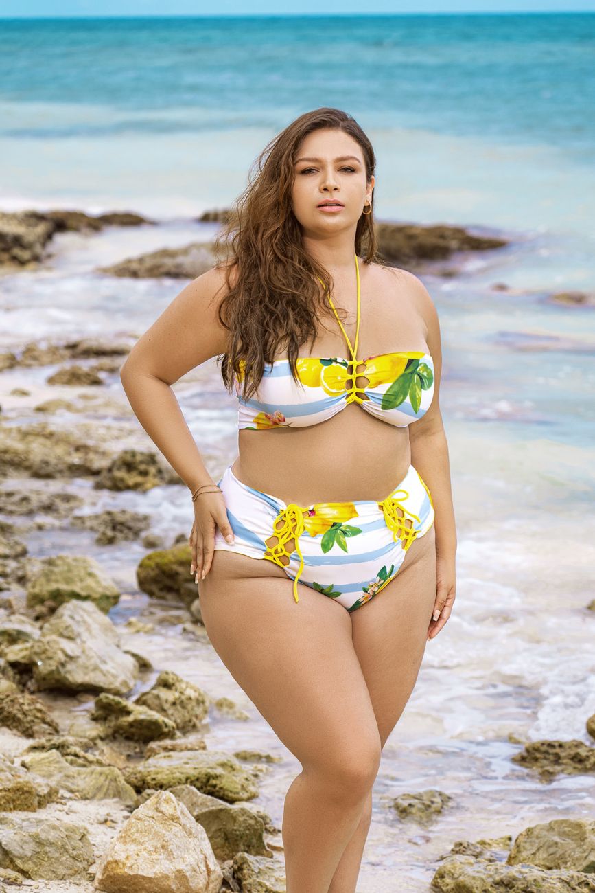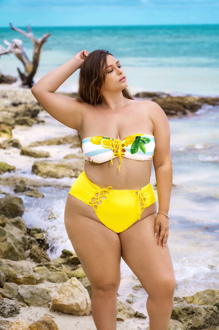 Imagine yourself sailing on a yacht through turquoise waters, sunbathing, and drinking champagne. The perfect bikini for this summer dream is this reversible two-piece. On one side a refreshing lemons on blue striped print and a vibrant citrus yellow on the other. Strapless top with front lace-up design and matching high-waisted medium coverage bottom.