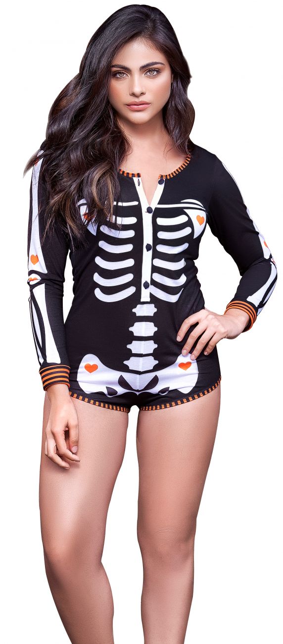 Long-sleeve skeleton romper with striped trim and functional front buttons, perfect for a Halloween night in.