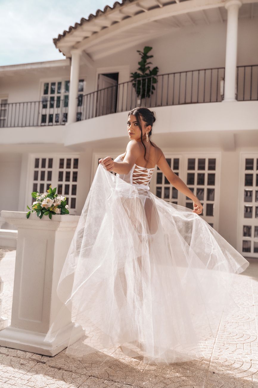 Crafted from white mesh with eyelash lace trims, it includes a full-length