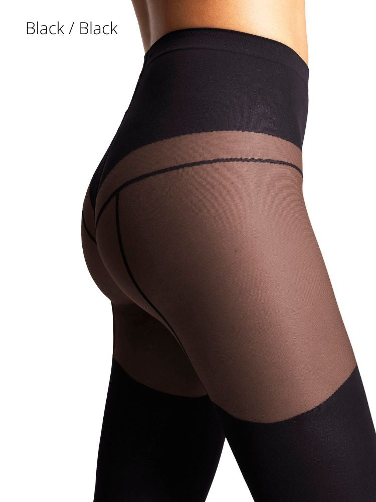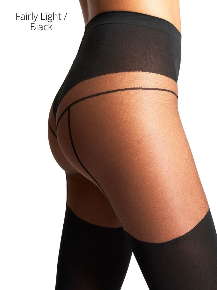 Suspender Tights- These circular-knit tights use contrasting panels to seductive effect, creating the look of a sensual garter belt and stay-ups. A knitted-in waistband keeps them securely in place.
