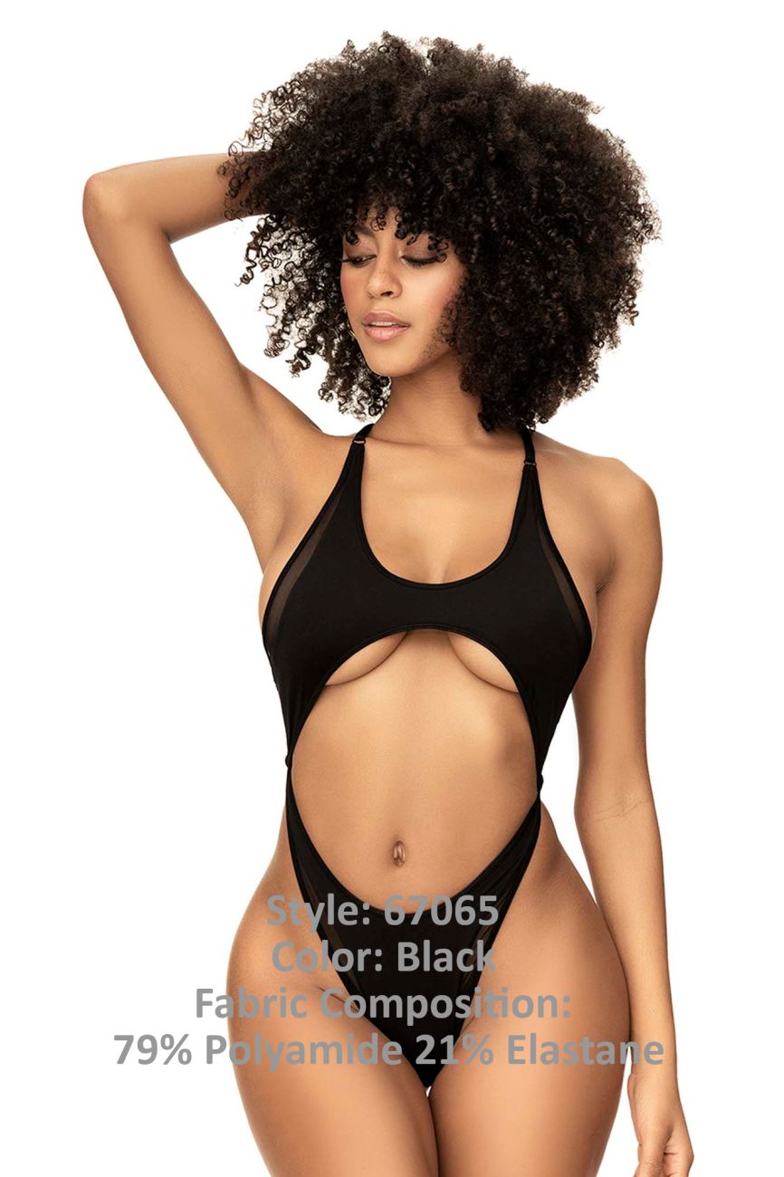 A sexy and revealing monokini with underboob design, adjustable straps, and Brazilian bottom coverage.