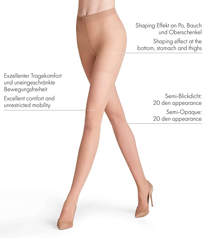 For that perfect look. FALKE's Shaping tights help to have a beautiful figure for any occasion. Shaping effect thanks to gentle and invisible body-sculpting effect at the bottom, stomach, and thighs. Unrestricted freedom of movement and excellent comfort thanks to the use of innovative materials. that hug your legs without constricting them. Even, a transparent mesh structure thanks to its 3D knitting technology with a matt finish. High-quality flat seam ensures exclusive comfort, hygienic gusset in net look and toe with a soft seam of the finest quality. 20 den appearance.