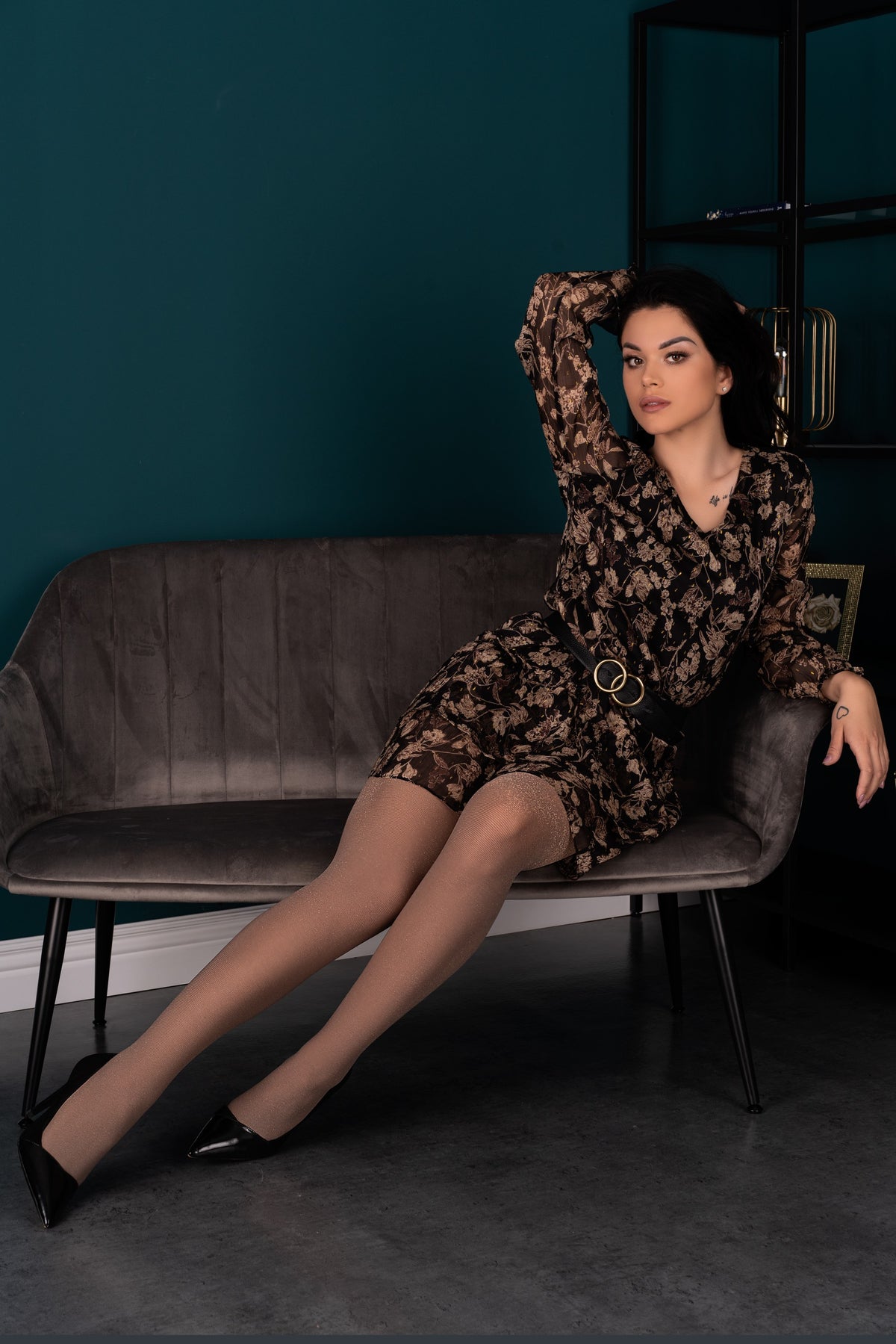 We love nude shades and, with them in mind, we've created this golden model accented by a copper-colored thread running through it which lends it a dash of added nobility. It goes perfectly with cashmere items. In addition to beige and chocolate browns, it also nicely complements classic black or holiday colors: red or bottle green. With Gold Rush, your legs will attain a beautiful, illuminated appearance and you'll luxuriate in the premium quality of these stockings with every step you take.