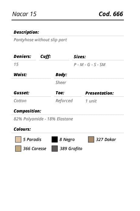 Smooth and silky Nacar 15 Pantyhose utilize a semi-gloss knit that fits like a second skin. Nacar 15 has a panty, reinforced toe, and is perfect for wear with most outfit choices. Nacar 5 is a great pair of pantyhose for everyday wear to enhance your leg's natural beauty.