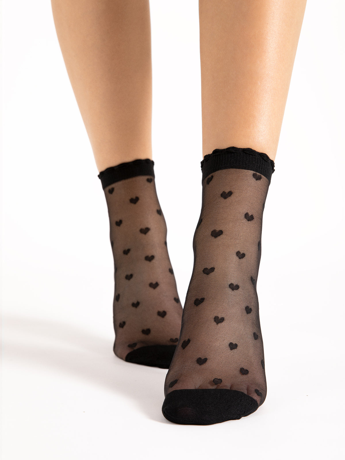 The timeless heart pattern is back and ready to steal your hearts! Due to popular demand, we’re excited to add this beloved design to our collection for the long haul. These socks feature small black hearts on either nude or black fabric, offering a classic look that never goes out of style. With a reinforced toe area and a comfortable black cuff, they also include a delicate frill around the ankle for a touch of charm.