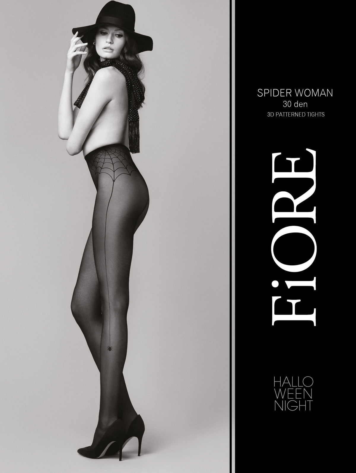Fantasy tights made of fine net with a patterned panty portion and a spiderweb and a spider motive on both outer sides of legs on different heights.