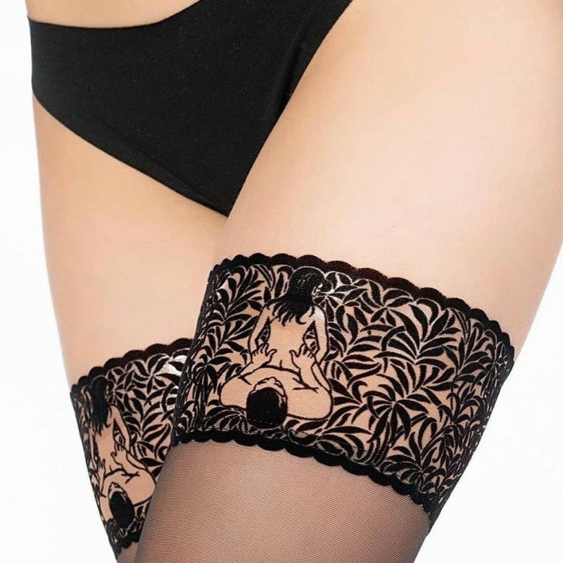 These sheer footed stockings feature a sheer design that ends at the thigh with a wide band of lace showcasing enticing imagery.
