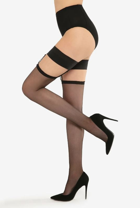 A sensual set of garters with clasps and classic stockings finished with a decorative picot.