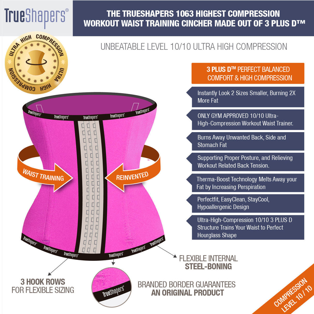 The TrueShapers 1063 Highest Compression Workout Waist Training Cincher made out of 3 Plus D TM. Instantly Gives You Natural Hourglass Curves Plus 2X Faster Results so you fit into that little black dress this week!